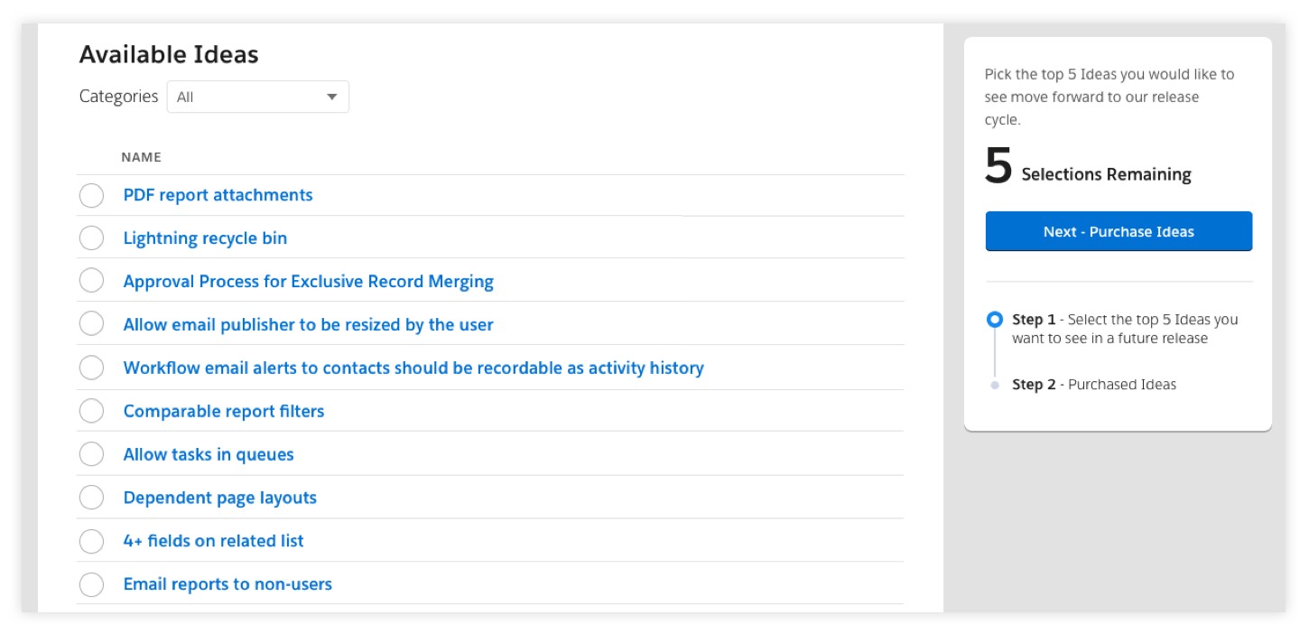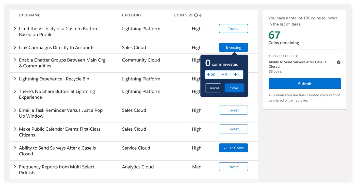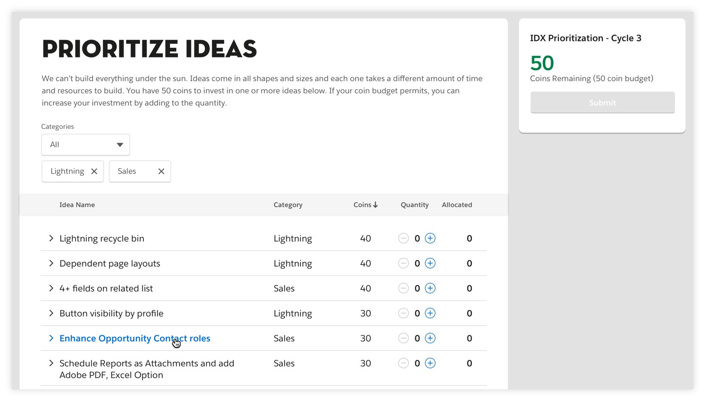Trust and transparency are the most important values at Salesforce, and we look to our community of customers and partners as trusted advisors. But with the sheer number of ideas on the IdeaExchange many of those great ideas lost traction. There needed to be a way where the company could pinpoint amongst the tens of thousands of ideas which ones our community wanted to see become features. Essentially an intuitive and engaging experience that could put our users in the shoes of our product teams in helping shape our roadmap, with an understanding that there are limited resources and a limited number of features could be delivered during each release.