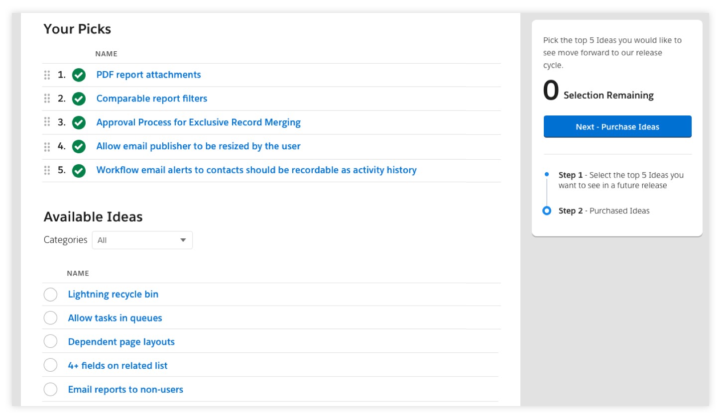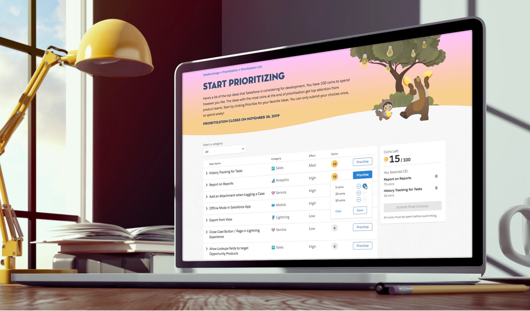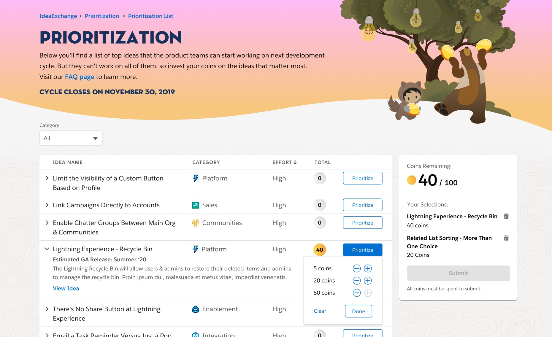 Trust and transparency are the most important values at Salesforce, and we look to our community of customers and partners as trusted advisors. But with the sheer number of ideas on the IdeaExchange many of those great ideas lost traction. There needed to be a way where the company could pinpoint amongst the tens of thousands of ideas which ones our community wanted to see become features. Essentially an intuitive and engaging experience that could put our users in the shoes of our product teams in helping shape our roadmap, with an understanding that there are limited resources and a limited number of features could be delivered during each release.