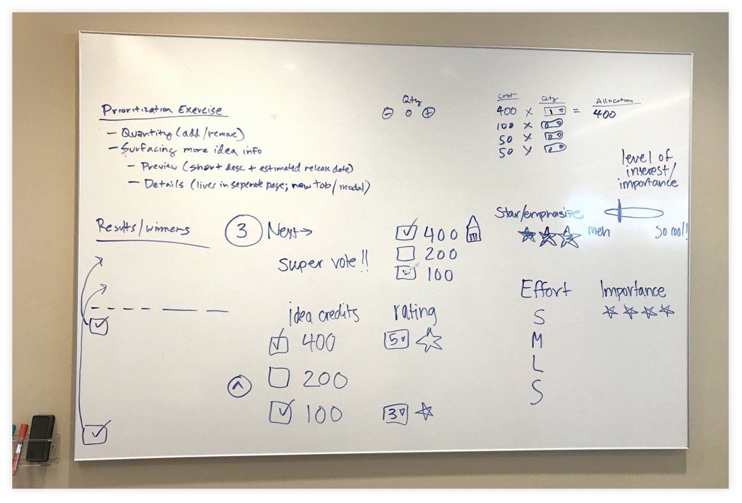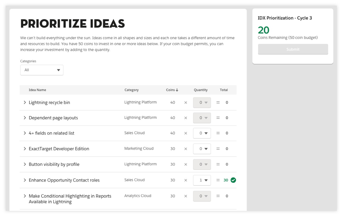 The Cost + Quantity Dropdown Concept was similar to the Cost + Quantity Button Concept with the difference being the user interface used to select the quantity is a dropdown. But from the user feedback, the challenge with the quantity model was that it limited the user from selecting multiple quantities for higher cost ideas. We considered increasing the overall budget but decided that it would complicate the usability significantly, essentially more calculations for the user. Furthermore, our research indicated that associating an idea with multiple quantities was confusing from an delivery standpoint because ultimately it was still only a single feature we would be shipping.