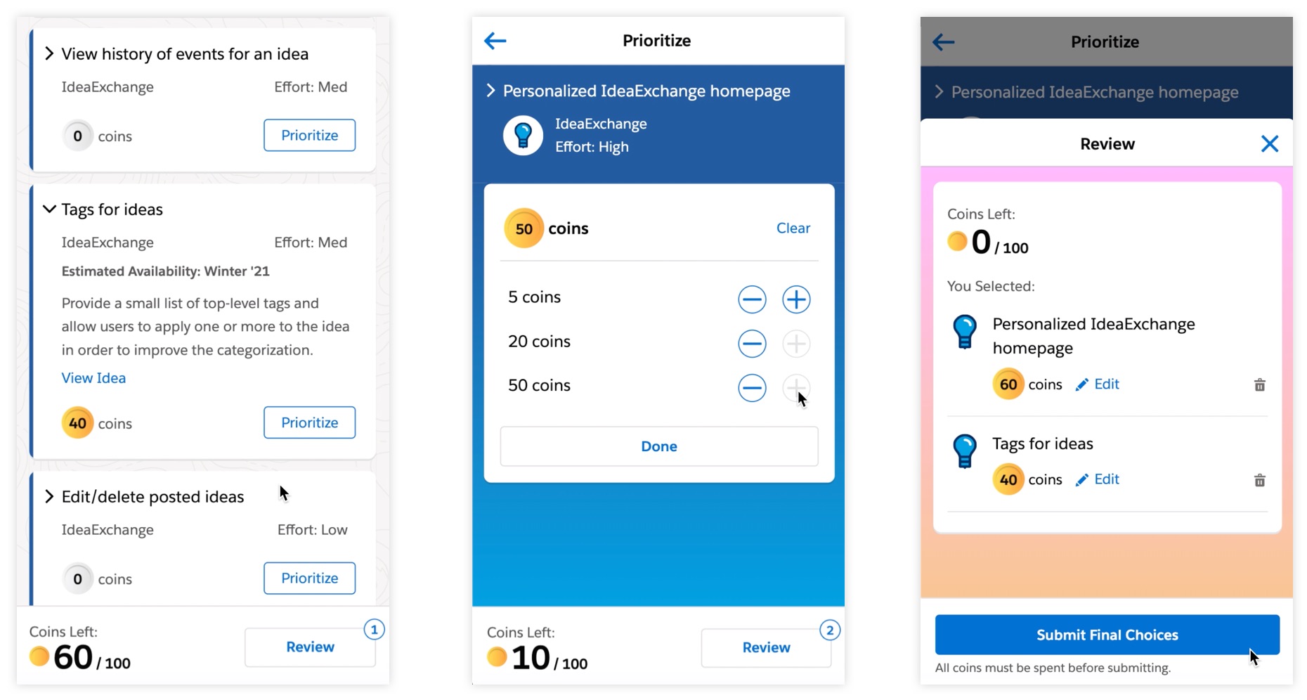 Users are given 100 coins to allocate, using increments of 5, 20, 50 coins. Selections are listed in their cart on the right. Additional idea information can be viewed under the accordion when needed.