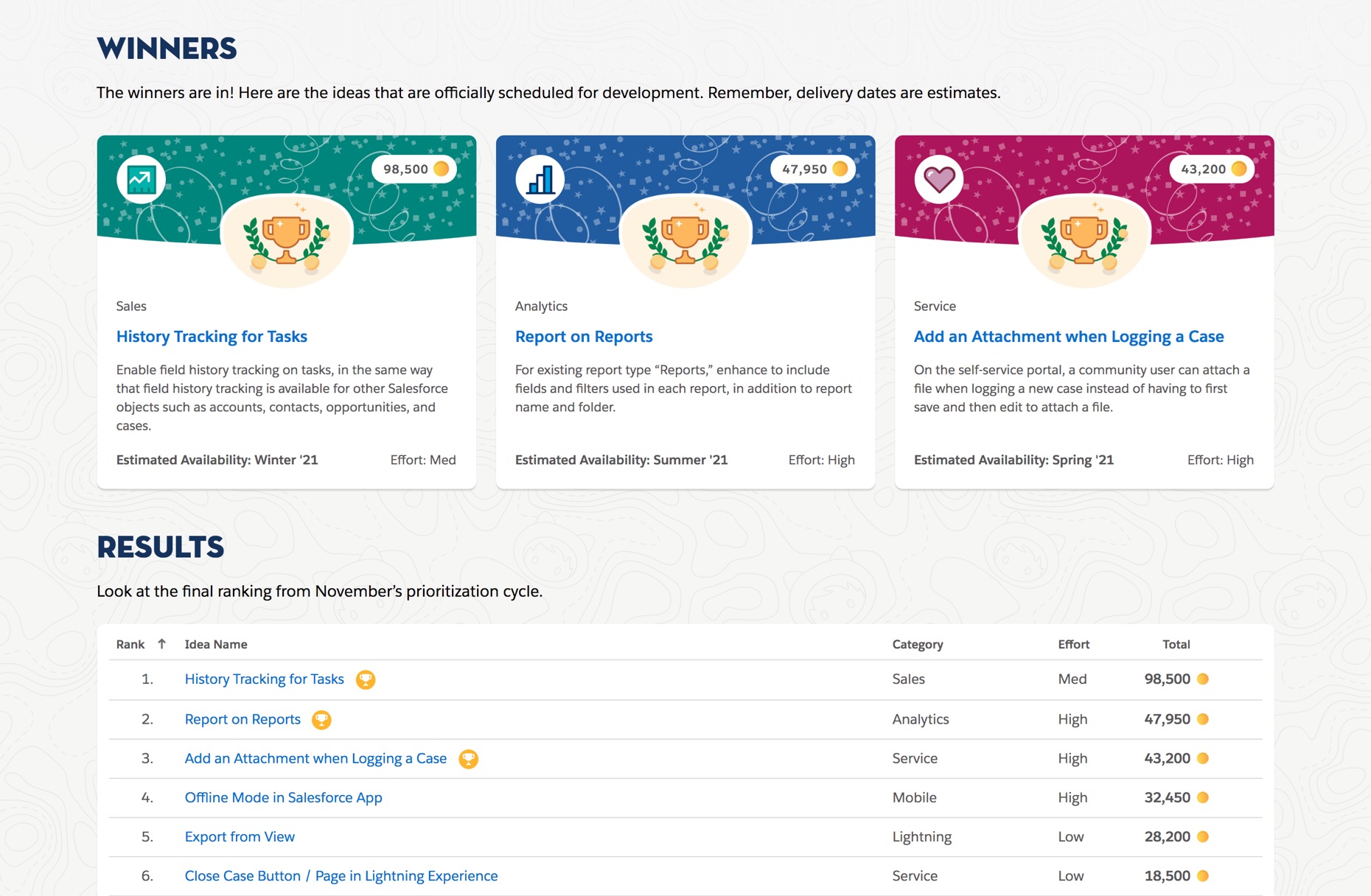 When we launched the first official Prioritization cycle in early 2020 and the positive feedback was tremendous. Our community wanted a democratic way to help shape the Salesforce roadmap, and Prioritization surely fulfilled that need. As Prioritization continues to collect more data through future rounds of Prioritization, further innovations and improvements to the product will be made. Emphasis will be placed on additional methods for capturing insights, thus better information on which features our customers and users want the most. In addition, monitoring the level of engagement and usage with the goal continued improvements to the overall experience.
